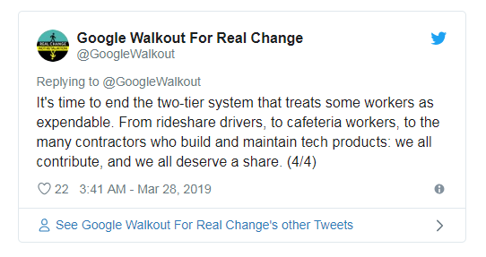 这是谷歌“影子劳动力”成员的常态,这支由临时工和承包商组成的队伍的人数超过了谷歌的全职员工人数。今年早些时候,谷歌员工罢工活动的组织者发布了一份声明,支持Uber和Lyft司机的罢工,他们不是这些公司的正式员工,因此薪资待遇更差。在其中,他们批评谷歌自己的“临时工、供应商或承包商”分类,使公司“放弃了对大部分劳动力的责任”。