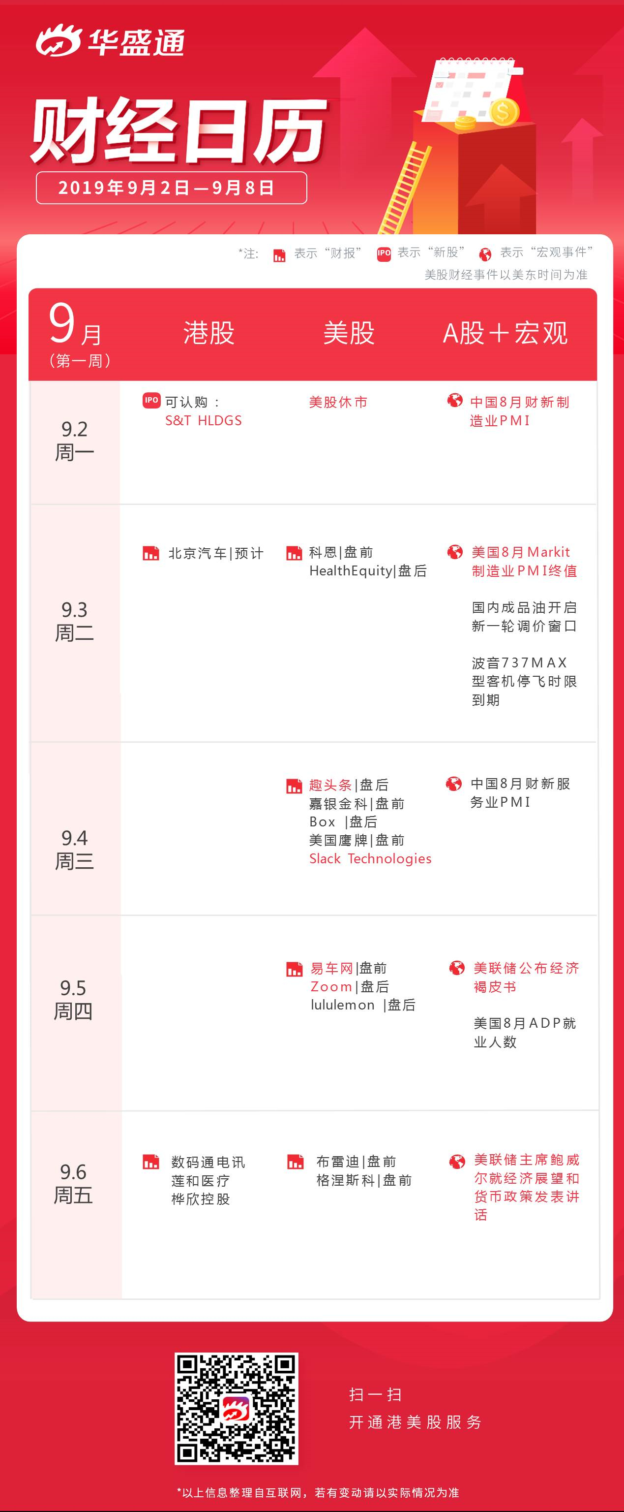 以上即为本周港美股、A股及宏观资讯一览,祝新的一周投资顺利~点击“日历”专区,了解本周更多财经大事↓
