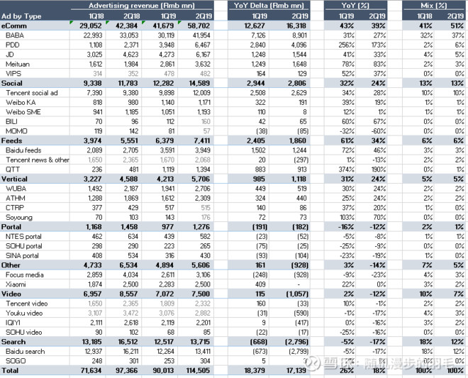 - 从2Q19上市公司的广告收入看,电商的广告收入年对年有Rmb16bn(bn为十亿元,单位下同)的增量,几乎相当于整个中国上市互联网企业广告收入的增量。