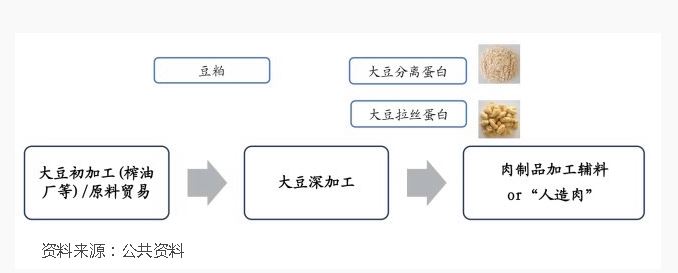 目前,市面上常见的人造入多为植物类,依托大豆等原材料。人造肉的大豆需求量还不足以影响大豆供需,但随着产业链不断延伸,对大豆业可能会产生影响。当前中国大豆种植和深加工发展阶段还较初级,未来随着我国的大豆种植和深加工的产业升级,也能分享到人造肉行业发展红利。