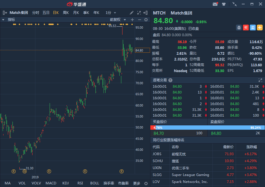 周末换脸APP“ZAO”一夜走红,用户可通过上传照片来替换成任何视频里的人,火爆换脸游戏是陌陌的最新泛社交尝试,公司近年来产品频出,近期财报业绩也超市场预期。放眼国外,同样火爆的美版“陌陌”Match Group在国外快速发展,股价涨势喜人。