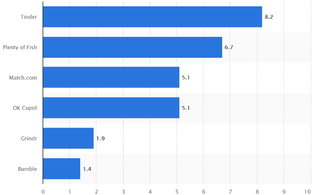 美股约会社交龙头Match Group在全球190多个国家和地区提供服务,美国市占率约为20%。旗下产品同样多样化,最重要的是多款产品用户优势相当明显,除大家了解的Tinder外,还包括:约会网站Match.com,约会软件Plenty Of Fish、老年约会网Our Time、日韩台湾约会品牌Pairs、法国交友网站Meetic、答题匹配的OkCupid及基于AI推荐约会对象Hinge App等。2018年,线上约会App按用户排名(百万级,如下图),其旗下产品占据了前四,且与第五名拉开较大差距。与此对比,陌陌的现象级产品仍相当匮乏,除了区域性市场及监管差异外,公司快速孵化社交新产品,同时拓展泛娱乐业务、强化主业直播对业绩的支撑也就不难理解了。