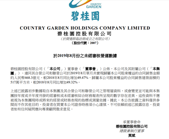 新浪港股讯 9月3日消息,碧桂园发布公告表示:8月合同销售金额约468.3亿元, 同比增加49.47%。归属本公司股东权益的合同销售建筑面积约517万平方米,较2018年8月同比增加49.32%。