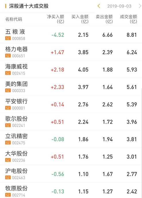 深股通净买入美的集团2.33亿元,净买入海康威视2.18亿元,净买入格力电器1.47亿元;净卖出五粮液4.52亿元。