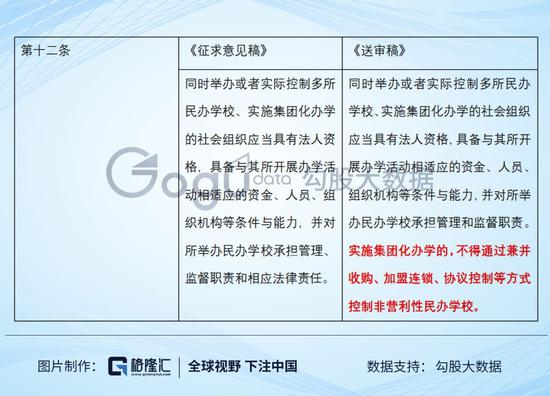 2018年2月份,教育部曾发布了一份《民促法(征求意见稿)》,这份《征求意见稿》中对于义务教育还比较“宽容”,并没有特别严苛的要求。而到了当年8月的《送审稿》,则在里面添加了这么一条“实施集团化办学的,不得通过兼并收购、加盟连锁、协议控制等方式控制非营利性民办学校。”