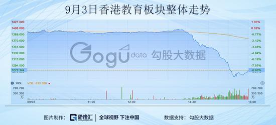 今天下午,港股教育股忽然集体跳水,2点半左右开始放量下跌,截至收盘,整个教育板块的跌幅为8.6%。