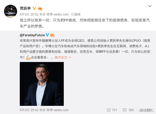 9月3日,FF正式宣布任命毕福康(Dr. CarstenBreitfeld)为全球CEO。同时,FF创始人贾跃亭辞去了原CEO职务,出任CPUO(首席产品和用户官)。