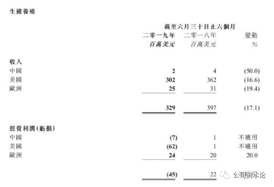 此外,公司生猪养殖也录得收入大幅下滑17%,中国、美国、欧洲业务全部下滑。中国业务亏损 0.07 亿美元,主要是由于加速出栏及提升生物安保费用所致;美国业务亏损0.62亿美元。