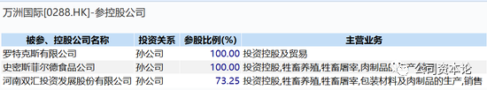 万洲国际业务涵盖了生猪养殖、生猪屠宰、肉制品和生鲜猪肉的加工和销售,公司在猪肉行业的所有关键环节均独占鳌头。目前控股双汇集团和史密斯菲尔德。其中,万洲国际通过控制罗特克斯100%股权持股双汇发展73.25%的股权。史密斯菲尔德为其100%控股孙公司。