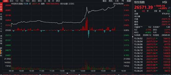 新浪港股讯 9月4日消息,今日恒指高开高走,午后出现不足半小时暴涨至4%的情况,临近尾盘,恒指涨幅进一步扩大,最大涨幅为4.41%,高见26654.21点,涨逾千点,最多涨1126点。截至收盘,港股恒指暴涨3.9%,报26523点,日内涨近千点,创去年11月2日以来最大单日涨幅。