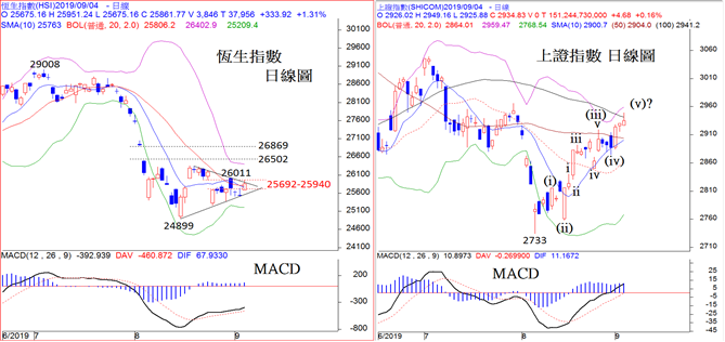 A股方面,上證指數繼周一向上突破50天平均線阻力高收之後,今早隨即升抵高一級的100天平均線阻力2941及接近20天保力加通道上限線阻力2960。倘若今日保持在100天平均線之下收市,則有機會形成「射擊之星」的利淡形態,增加短線見頂的機會。
