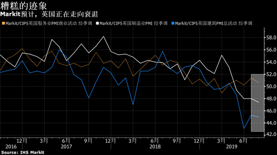 IHS Markit周三发布采购经理指数显示,上月服务业几乎停滞。Markit表示,类似的指标暗示,英国制造业和建筑业深陷衰退,指标暗示第三季度经济势将萎缩0.1%。
