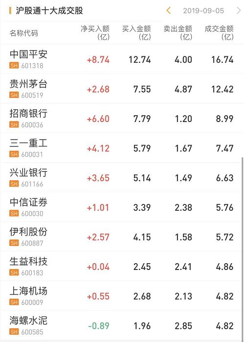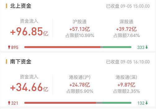 北上资金今日净流入96.85亿元,沪股通净买入中国平安8.74亿元、三一重工4.12亿元、兴业银行3.65亿元、招商银行6.60亿元,深股通净买入五粮液1.96亿元、中兴通讯1.48亿元、东方财富4.20亿元、净买入平安银行2.17亿元。