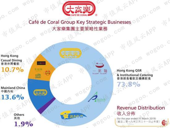 “大家乐”、“一粥面”、“泛亚饮食”和“活力午餐”这四个品牌在香港的收入属于“香港速食餐饮及机构饮食”部门,这是大家乐集团收入最高的业务部门,2019财年的营收占比达73.8%,约62.7亿港元。