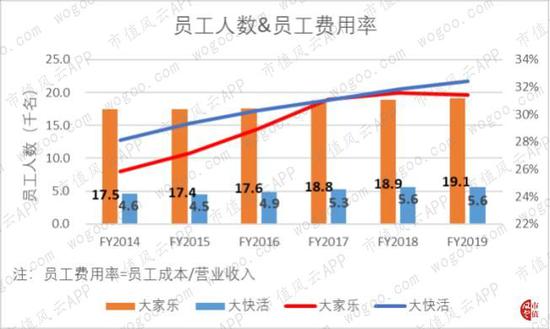 近年来,两家公司的员工费用率均一路上升。2019财年,大家乐集团和大快活集团的员工费用率分别为31.4%和32.4%,分别较2014财年提升了5.6个百分点和4.3个百分点。