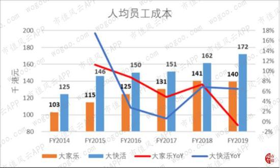 员工费用率上升的主要原因是人均员工成本的增加。2014-2019财年,大家乐集团和大快活集团的人均员工成本的CAGR分别为6.2%和6.8%,两家公司人均员工成本的提升幅度相近。