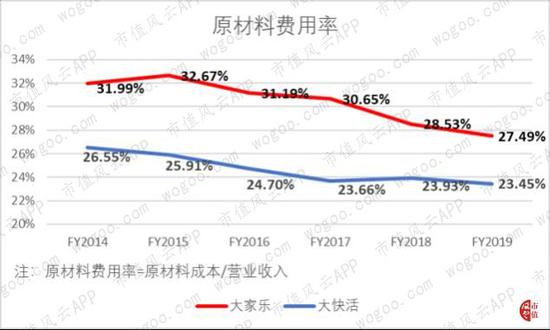 原材料成本是两家公司历年来的第二大成本,但其占营收的比重近年来不断下降。2014-2019财年,大家乐集团和大快活集团期间的原材料费用率分别总体下降了4.5和3.1个百分点,截至期末分别为27.5%和23.5%。