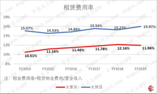 租赁成本是均次于员工成本和原材料成本的第三大成本,两家公司的租赁成本占营收的比重多年来均较为稳定。2019财年,大家乐集团和大快活集团的租赁费用率分别为16%和12%,较2014财年均只上升了1个百分点。