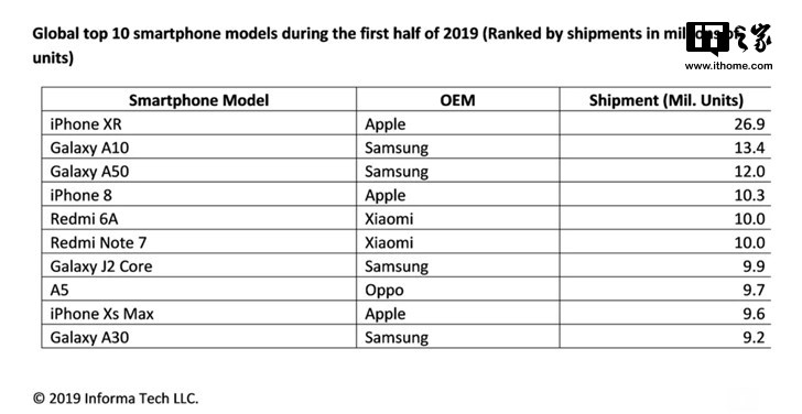 2017年发布的苹果iPhone 8和iPhone XS Max也是今年上半年的顶级销量智能手机之一。三星手机A10和A50售价均低于400美元,分别排名第二和第三,出货量分别为1340万和1200万。三星旗舰Galaxy S10手机并没有上榜。另外小米Redmi 6A和Redmi Note 7分别排名第五和第六,出货量均为1000万。