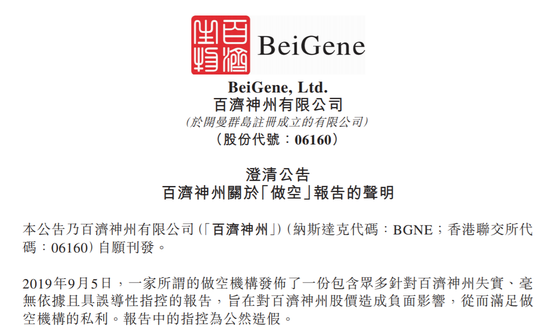 2019年9月5日,一家所谓的做空机构发布了一份包含众多针对百济神州失实,毫无依据且具误导性指控的报告,旨在对百济神州股价造成负面影响,从而满足做空机构的私利。报告中的指控为公然造假。