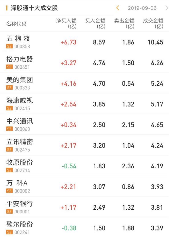 深股通净买入五粮液6.73亿元,美的集团4.16亿元,格力电器3.27亿元,海康威视2.54亿元。