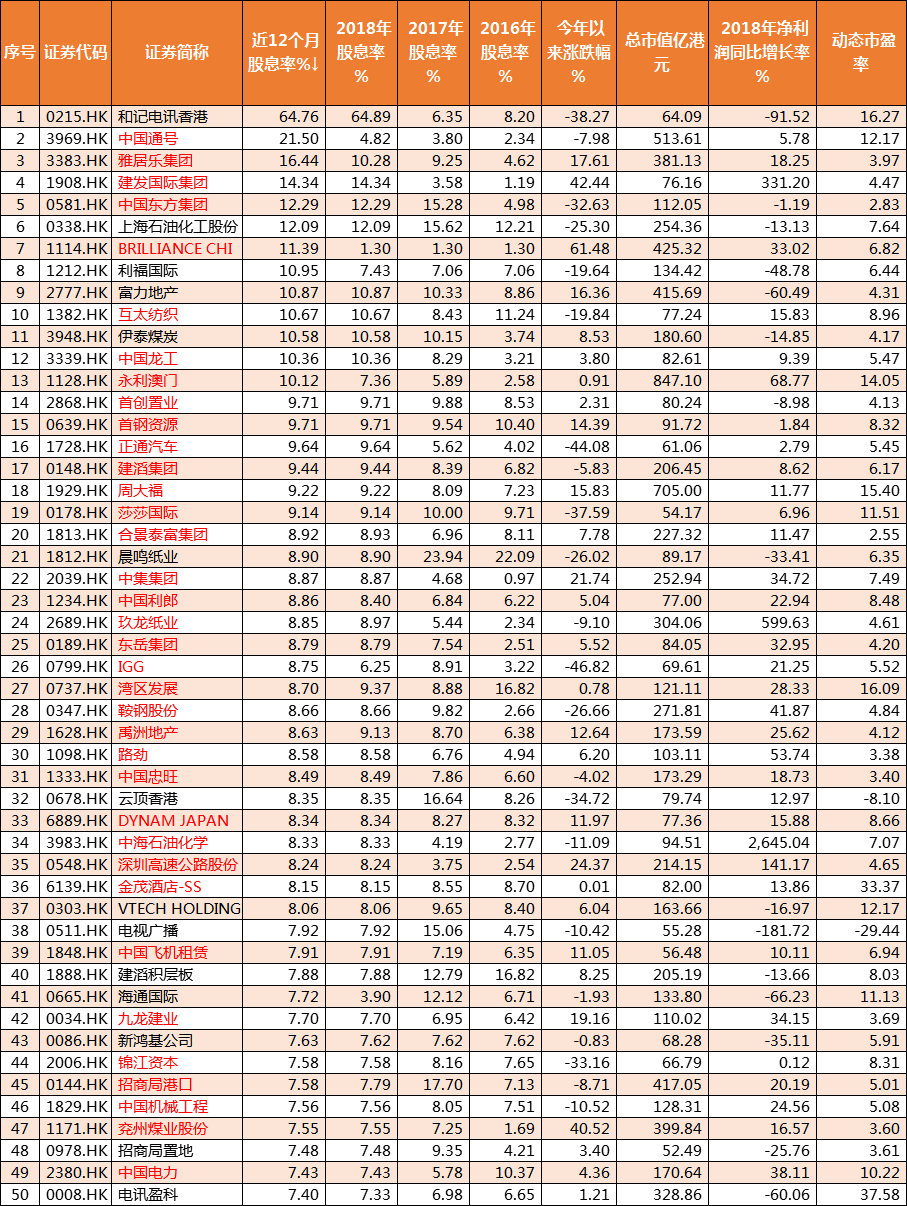 再次是业绩稳定性,高股息的个股存在一个“陷阱”需要规避。举例说明,如果一家公司的股价为10元,今年分红为0.5元,那么股息率为5%。但如果其业绩下滑,股价跌至5元,公司将分红减为0.25元,那么股息率仍为5%。但对于投资者而言,这0.25元远远无法弥补股价腰斩的损失。所以关注季度或半年业绩很重要,这反应公司最新经营情况。像和记电讯虽然近12个月的股息率高达64%,但其2018年净利下跌了91%,经营并不稳定了。而笔者通常选取扣非净利润的同比增长不能低于-10%。