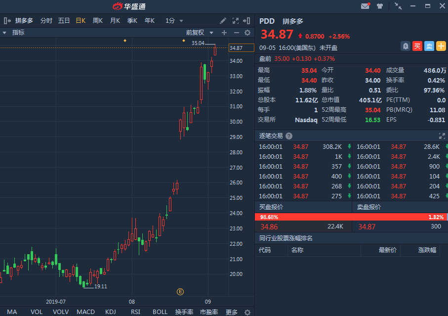 今年二季报的远超预期更是激起资本市场的热情,Q2总营收同比增长169%至人民币72. 90 亿元,环比增长60%,远高于市场61亿元的普遍预期。盈利方面,亏损有所改善,调整后净亏损达4.113亿有UAN,环比下滑70%。关键指标同样超预期,GMV达到7091亿元,同比增长171%。季末APP平均月活用户数达3. 66 亿,同比增长88%,平台年活跃买家数达4. 832 亿,同比增长41%。受财报利好影响,财报发布后股价大涨近16%,之后的几个交易日股价涨幅超过15%。