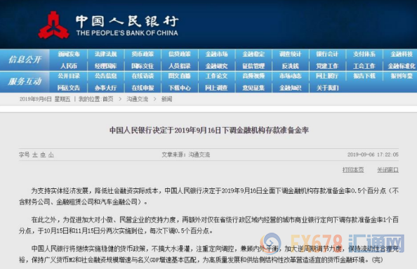 周五据中国人民银行官方网站报道,中国人民银行决定于2019年9月16日下调金融机构存款准备金。