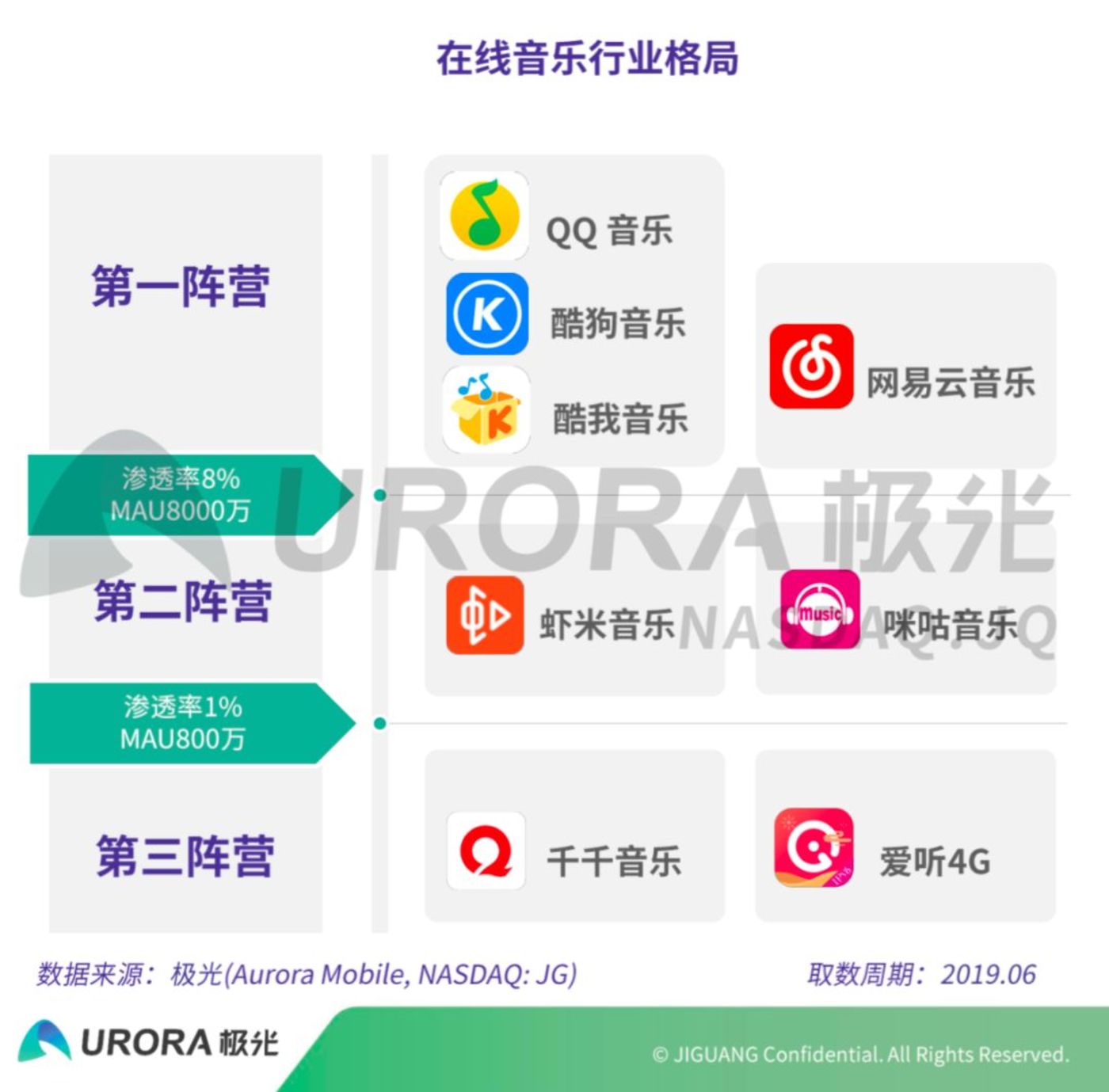 首先是行业格局。前几天,极光大数据发布了《国内在线音乐社区研究报告》,报告以渗透率8%和MAU 8000万、渗透率1%到8%和MAU 800万为界,将目前在线音乐行业的几大平台划分为了三大阵营。