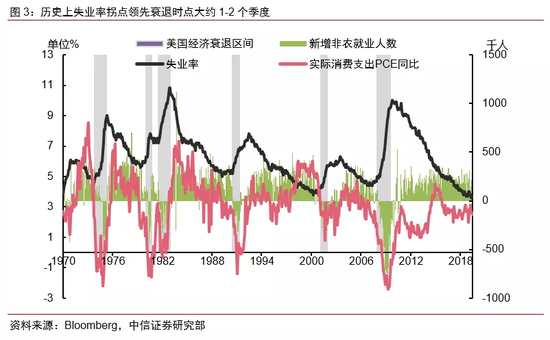 失业率可能将于明年初出现拐点,美国经济明年上半年衰退概率较小。一方面,近期美国制造业和非制造业就业指数反映出市场对未来就业的担忧在加剧。美国制造业就业指数47.4,非制造业就业指数53.1,远低于前值的51.7和56.2。虽然当前美国经济短期韧性较强,但支撑经济的主要是后周期的消费和地产,在全球经济放缓以及美国PMI的持续下滑背景下,美国经济已确认进入下行通道,后续就业放缓的趋势正在逐步形成。另一方面,从失业率的领先指标来看,首次申请失业金人数历史上大致领先失业率3个月。8月首次申请失业金人数合计96万,已经明显高于今年以来的中枢94-95万,目前该指标已经出现回升信号,预计失业率可能在明年初出现反弹(图2)。而历史上失业率拐点领先衰退时点大致1-2个季度(图3),因此如果失业率出现拐点信号进一步确认的前提下,美国经济至少在明年上半年之前出现衰退的概率较小,但后续衰退的概率会明显上升。