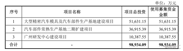 据招股书,祥鑫科技计划发行股份不超过3768万股,保荐机构为国信证券,计划募集资金9.89亿元,其中,5.16亿元用于大型精密汽车模具及汽车部生产基地建设项目,3.69亿元用于汽车部件常熟生产基地二期扩建项目,1.04亿元用于广州研发中心建设项目。
