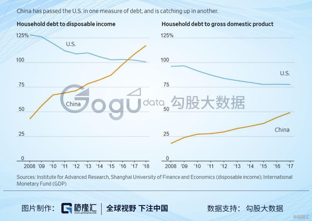 但我们知道,在GDP这块蛋糕的分配上,中国家庭拿走的比例没有美国家庭高,而可支配收入对个人才更有意义。所以我们换个维度,看家庭负债与可支配收入的比重,中国现在已经到了120%左右,美国降到了100%左右,2008年危机前夕是125%。