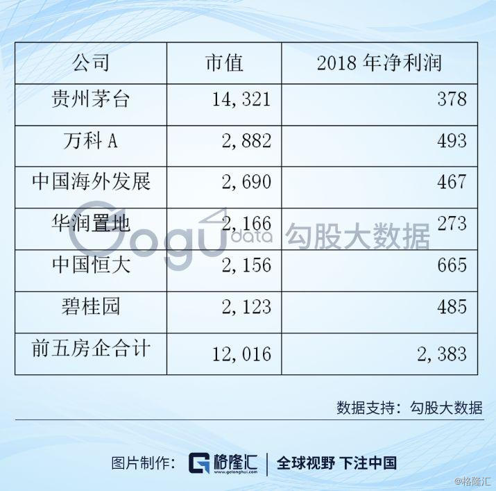 其实不独海天与万科,茅台一家的市值也已经超过了前五家房企的市值,同样,净利润只是其六分之一。