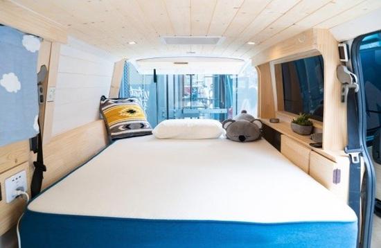 据报道,Koala Sleep Japan 会将一台普通的面包车改造成一个适合人睡觉的环境。他们选用的汽车也就是我们平时常见的面包车,车身外涂成 Koala Sleep Japan 品牌的天蓝色,同时还会印上考拉睡在床上的标志。公司在宣传这项服务的时候,在车上外加了一对考拉的耳朵,突出‘像考拉一样熟睡’的品牌属性。