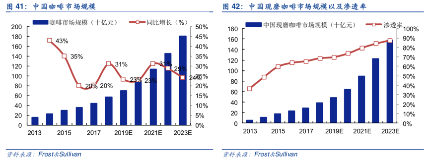 中石化进军咖啡业,前提是看到了国内咖啡市场巨大的增长潜力。根据Frost & Sullivan发布的数据,中国咖啡市场规模在2013-2018年间复合年增长率均超20%,而2018年市场规模已达569亿元,同比增长31%;此外,研究机构预测中国咖啡市场有望在2019-2023年继续延续该增长率,并预计在2023年达到1579亿的市场规模,渗透率有望提升至87%。