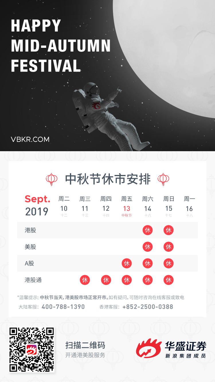 周五适逢中秋佳节,港股通和A股市场将会休市,而港美股市场依旧开市。赏花祭月之余,别忘了留意股市行情。提前祝各位中秋节快乐,投资顺利!