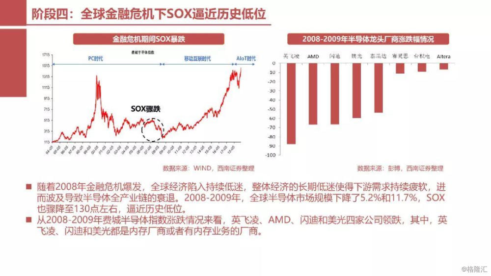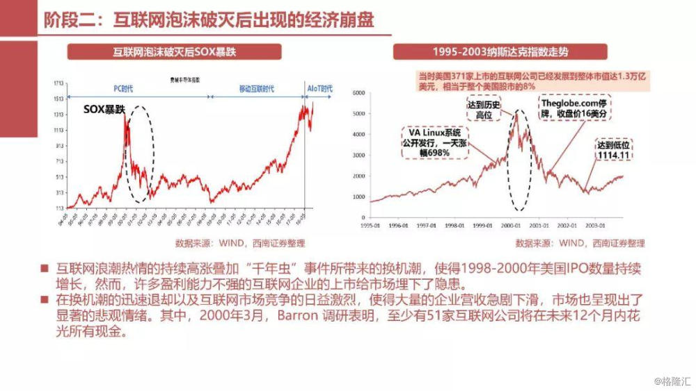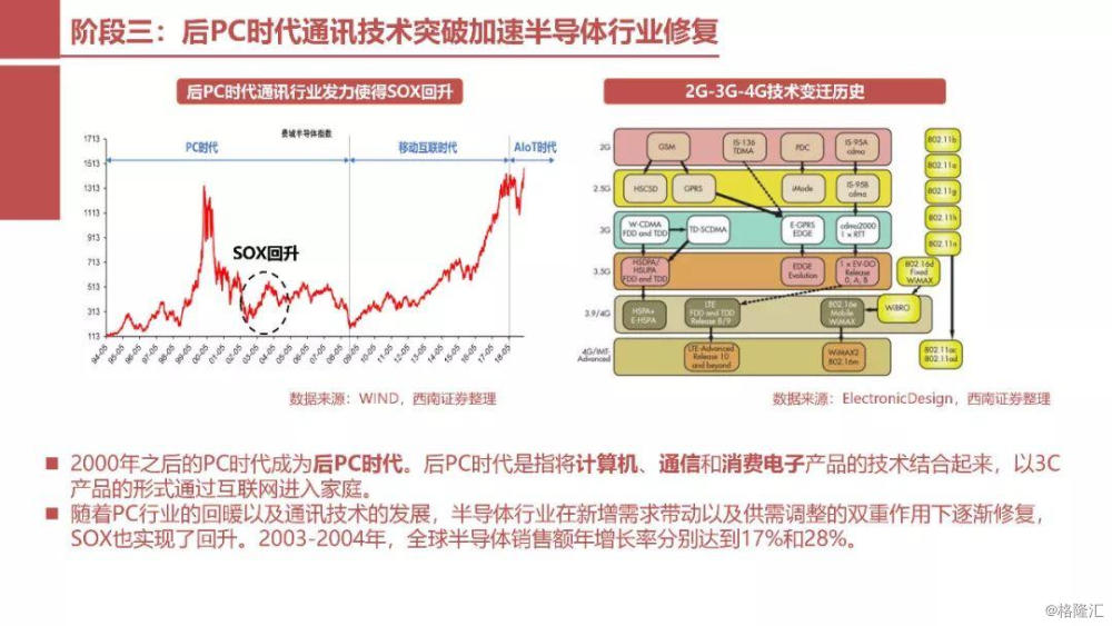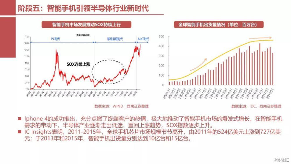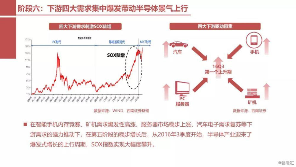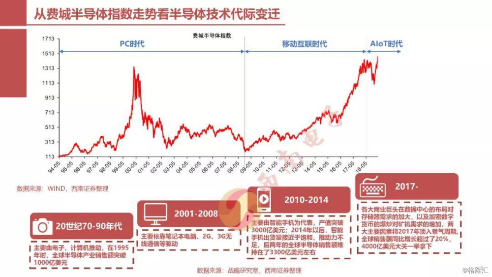 我们将费半指数26年来的走势划分为八个阶段,分别揭示了每个阶段背后的科技驱动因素以及领涨股情况。阶段一(1994~1999):PC互联网井喷阶段二(1999~2002):科网泡沫破灭阶段三(2003~2007):桌面电脑启动阶段四(2007~2008):金融危机暴跌阶段五(2008~2014):3G移动互联网启动阶段六(2015~2017):4G移动互联网爆发阶段七(2018~2018):创新真空+周期下行阶段八(2019~2025):5G前周期+5G后周期,全面爆发!当下!