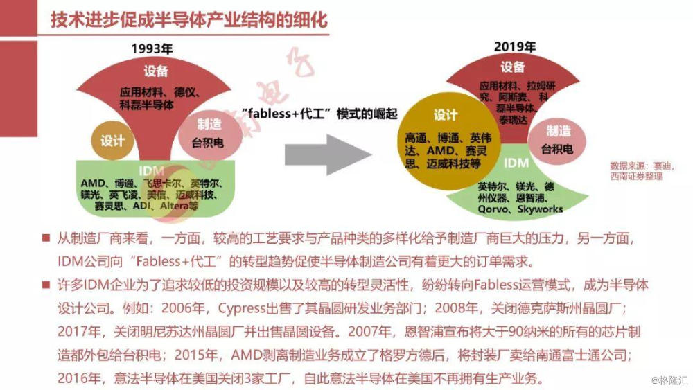 从PC->MI->AIoT的科技更替来看,背后的底层技术均是由芯片算力和通讯技术的不断提升,在此期间,全球科技巨头不断实现并购重组,同时商业模式也在不断演化,例如全球科技公司从IDM模式逐渐向Fabless+Foundry演化。