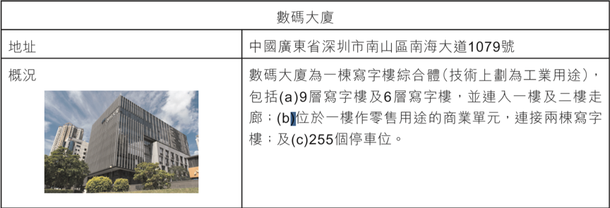 数码大厦为一栋写字楼综合体,包括15层写字楼、一层商业单元及255个停车位。可租赁总面积为4.04万平方米,租户数量为32名。当前租用率为79.9%,每平米平均月租为105.4元,物业评估价值为10.38亿元。