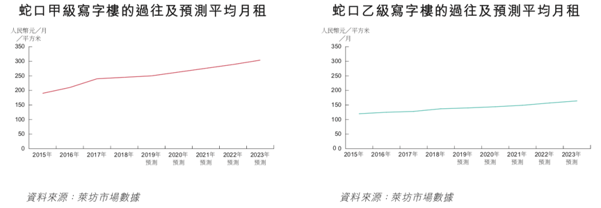 2015-2018年,蛇口甲级和乙级写字楼的平均月租呈稳步增长态势。根据莱坊市场数据预测,受益于深圳整体经济增长,预期2018-2023年间蛇口甲级及乙级写字楼的平均月租年复合增长率分别为7%及3.9%。