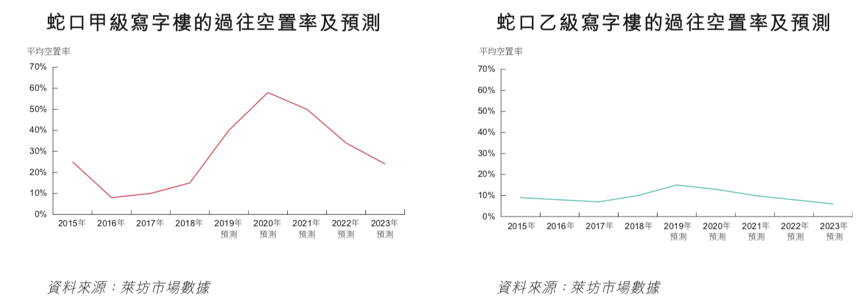 根据莱坊市场数据预测,蛇口甲级写字楼空置率将于2020年升至58%的峰值,原因与新建写字楼项目的完工有关,但预期在2023年将重新降至约24%的适当水平。蛇口乙级写字楼的空置率波动较小,预计2019年将达到15%的空置率峰值,但2020年至2023年将重新回到7%至10%的较低水平区间。