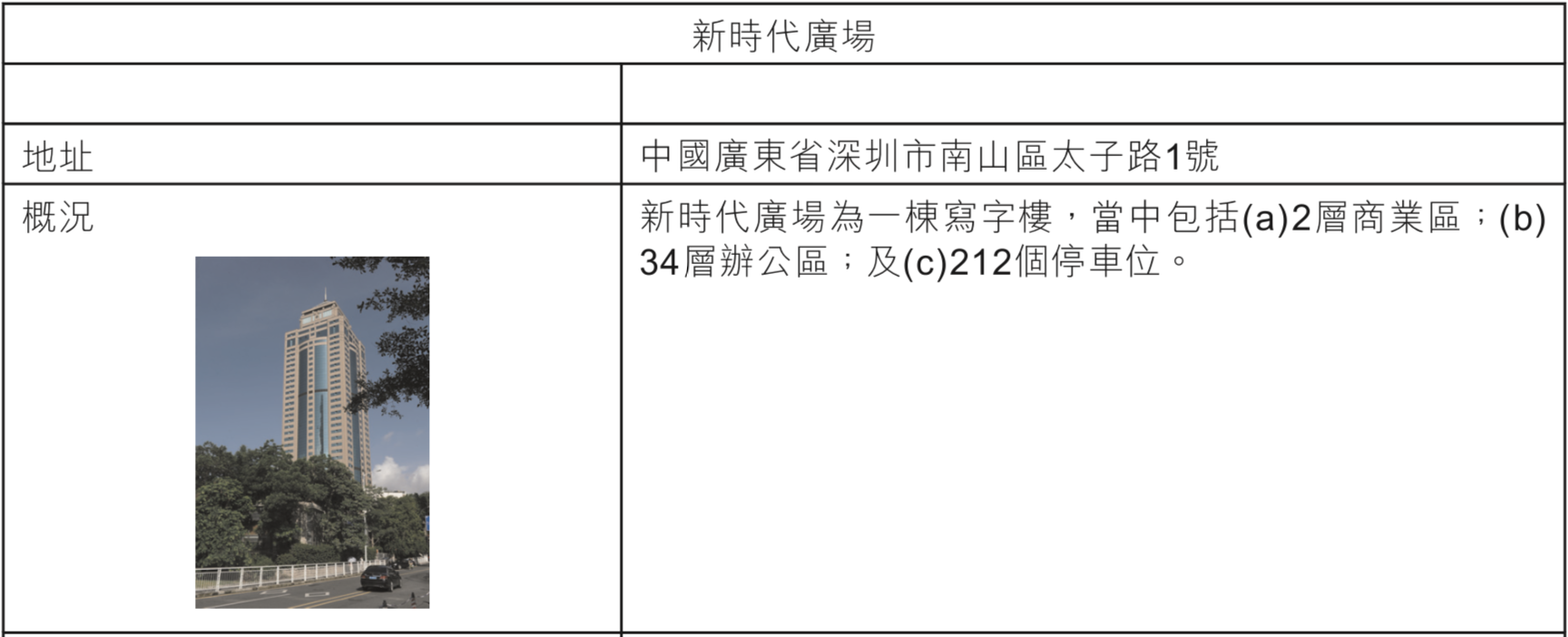 其中,新时代广场为一栋写字楼,当中包括2层商业区、34层办公区以及212个停车位。可租赁总面积达6.76万平方米,目前有66名租户。当前租用率为74.5%,每平米的平均月租金为156.1元,物业评估总价值为20.46亿元。