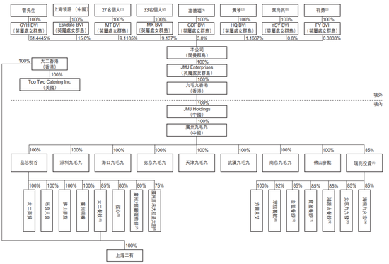 公司控股股东为管先生及GYH BVI公司,管先生透过其控股公司GYH BVI持有九毛九国际控股有限公司61.14%股权,为九毛九最终实控人。