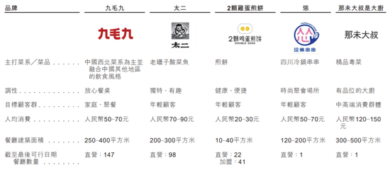 公司目前管理及经营五个自营独特品牌:九毛九、太二、2颗鸡蛋煎饼、怂及那未大叔是大厨,除2颗鸡蛋煎饼采取直营模式和加盟模式经营外,其余品牌全为直营模式。