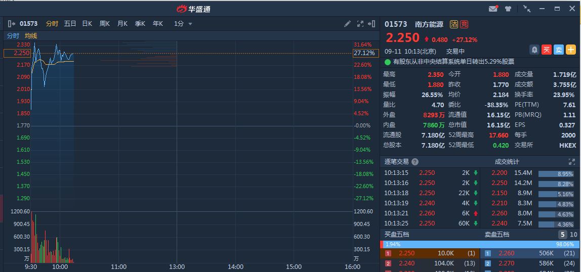 新浪港股讯 9月11日消息,“港股通新贵”南方能源连续遭到市场热炒,截止发稿,涨27.12%,报2.25港元,最新市值16.15亿港元,近三日已暴涨2倍。因恒生综合大型股指数、中型股指数、小型股指数实施成份股定期调整,深交所发布港股通股票名单发生调整并自9月9日起生效,南方能源获纳入。