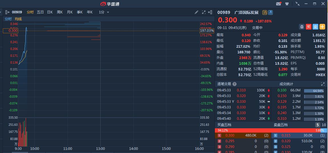新浪港股讯 9月11日消息,广泽主席崔薪瞳若干股份被强制出售,今早复牌股价暴涨逾200%,截止发稿,涨206%。报0.31元。
