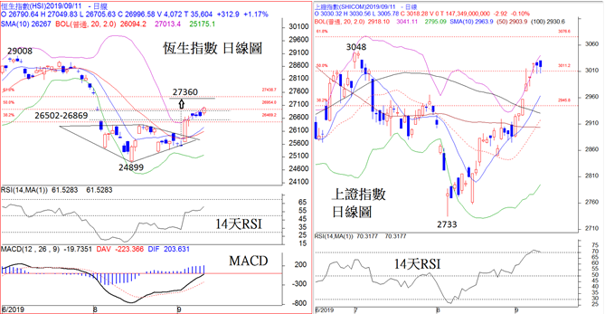 事實上,從以下三個角度看,恆指短線也有上升餘地:首先,恆指早前以「鑽石」形底部回升,其量度上升目標為27360;其次,9月9日的「綠星日」只能促使恆指短暫下調,但當日的頂部已被升破,表示升勢有機會延續至下一個「綠星日」為止,亦即9月13日(本周五);最後,在MACD維持明確買入訊號的情況之下,14天RSI只是升至62的水平,反映後市有上升空間。