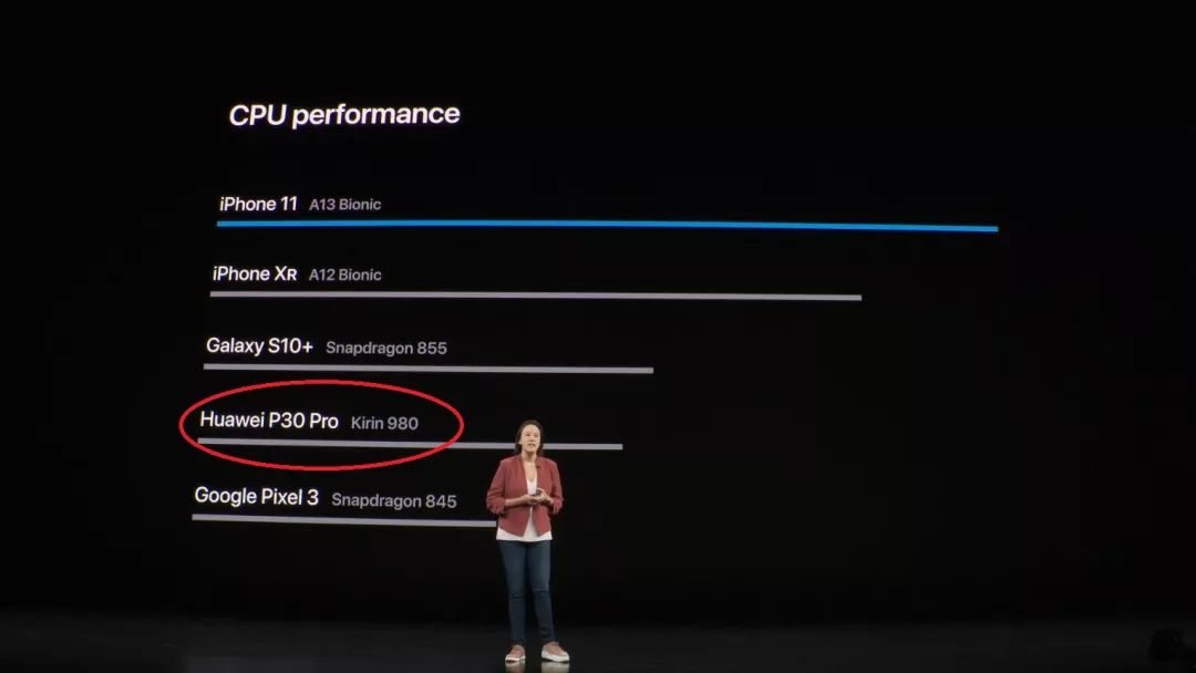 本次发布会上,苹果首次在主题演讲中搬出了竞争对手的产品,也首次将华为列为了友商并进行了对比。虽然必须承认A13性能真的非常强,但是用来对比华为去年发布的上一代处理器麒麟980处理器就有点不够大气了,今年华为刚刚发布了麒麟990处理器,虽然还没有正式应用到产品上,但是性能上必然也会有一定提升。