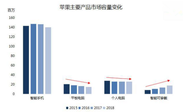 苹果主要的硬件产品中,除了Apple Watch所处的智能可穿戴市场还处于高速发展阶段,其余智能手机、平板电脑、个人电脑的市场容量都已经见顶,除了存量换机带来的增长,几乎不会再有随市场规模扩大带来的增量红利。