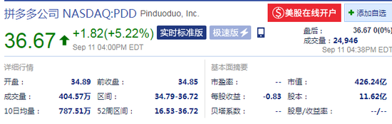 新浪美股 9月12日消息,周三美股收盘,拼多多涨5.22%,报36.67美元,股价创历史新高,市值达到426.24亿美元,和京东相差不到30亿美元。